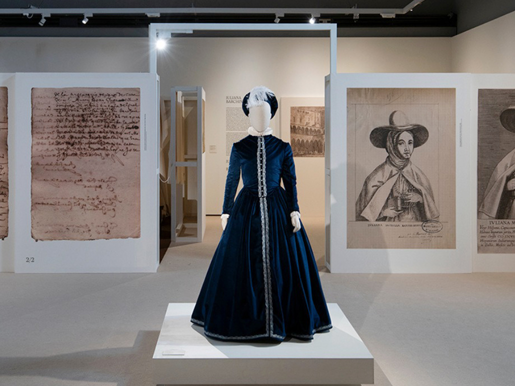 Maniquíes de pasta de papel para la exposición «El legado reencontrado de Juliana Morell (1594-1653)», donde se presentan un conjunto de piezas originales y reproducciones a gran formato de obras vinculadas a la autora, diversos muebles y objetos originales de la colección del Monasterio de Pedralbes, numerosos documentos de archivo inéditos, así como libros y manuscritos de Morell.