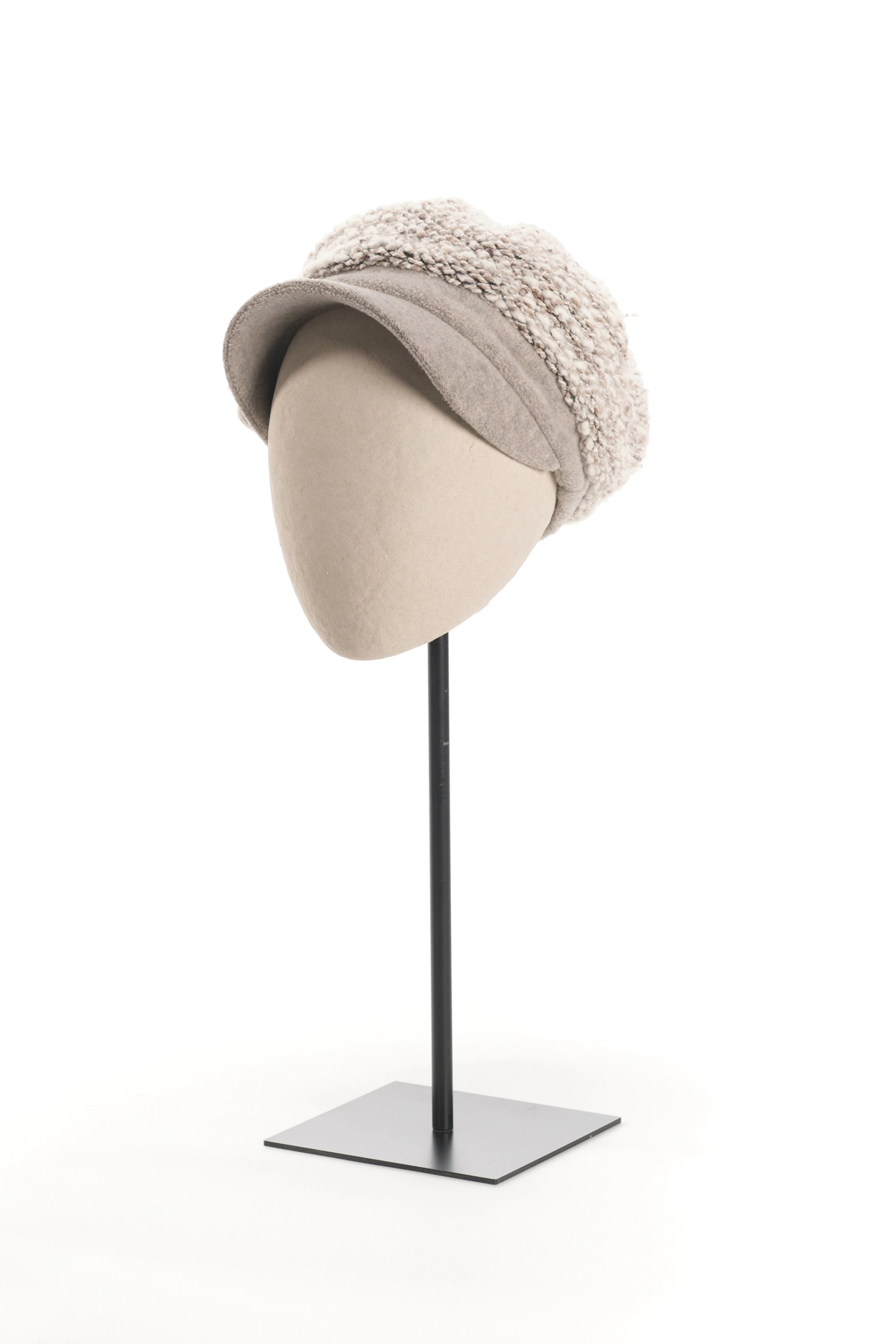 Showcase your headwear with elegance using our mannequin head in a distinctive egg form. Perfect for displaying hats, beanies, caps, and other accessories, this sophisticated piece is crafted from recycled paper paste for an eco-friendly and warm touch, while the metal baseplate ensures durability and stability. Available in two sizes to suit your needs, this display combines modern design with sustainability, making it an ideal choice for your displays.